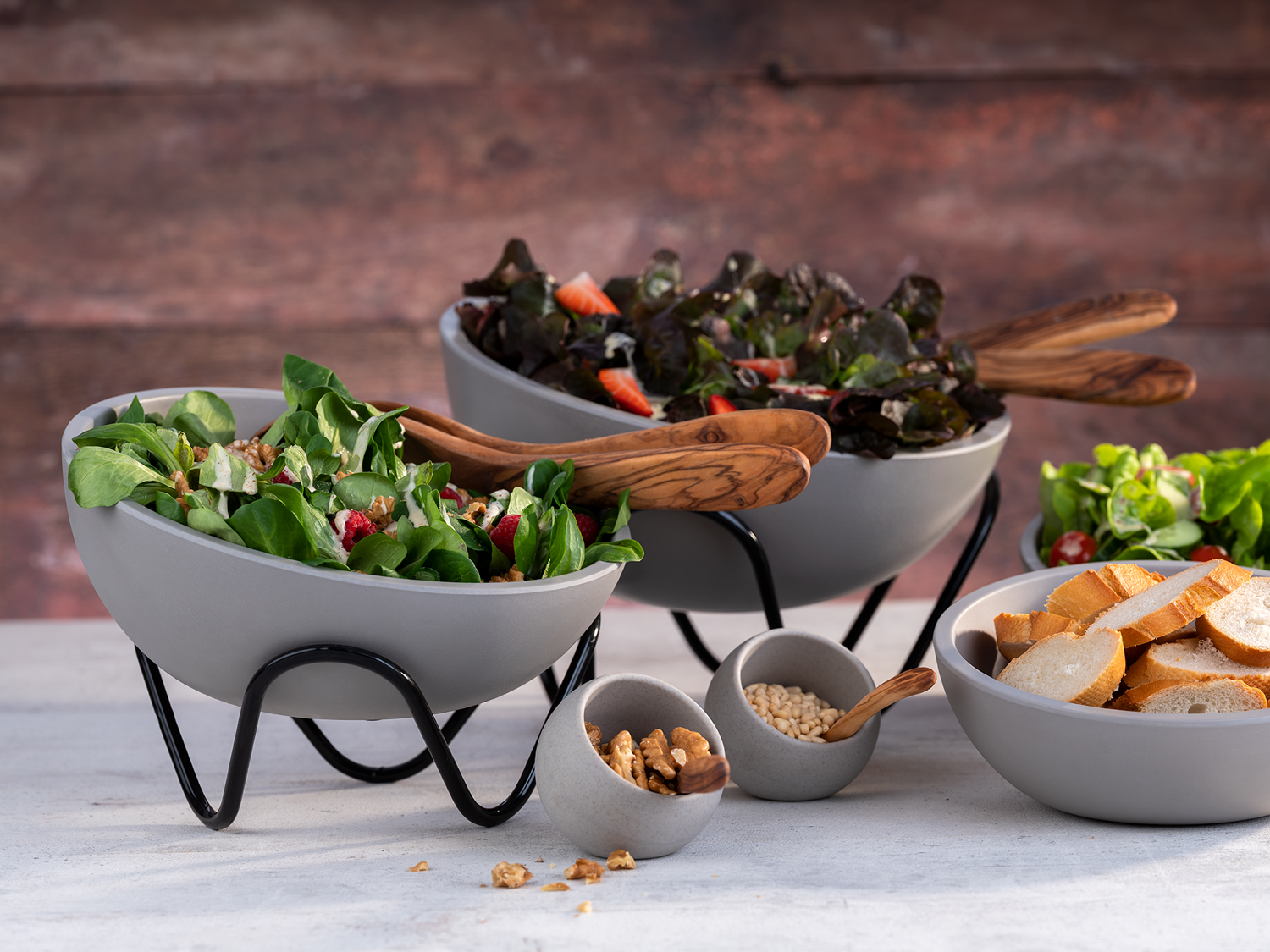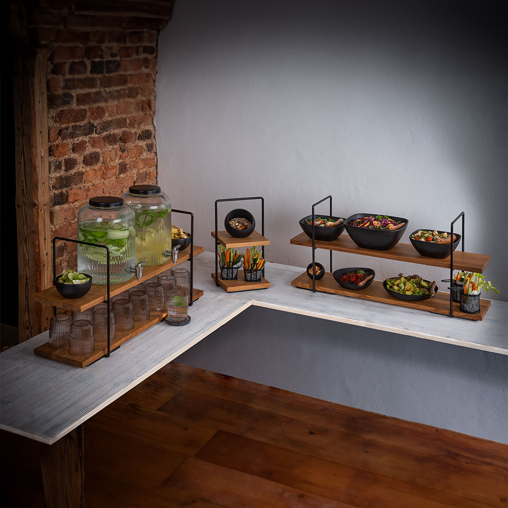 Bandejas y boles en melamina, soportes antideslizantes para realzar las presentaciones, chafing dish, expositores de madera para el pan o bollería, accesorios de vidrio, dispensadores para bebidas o cereales, cestas de mimbre, entre otros. Colecciones como “Frames”, de estilo elegante y sobrio, con líneas minimalistas y con gran potencial para crear atractivas composiciones de buffet. O “Superbox” cajas en madera de acacia, girables y apilables, que conectan creando espacios sorprendentes. Variedad de estilos y soluciones.